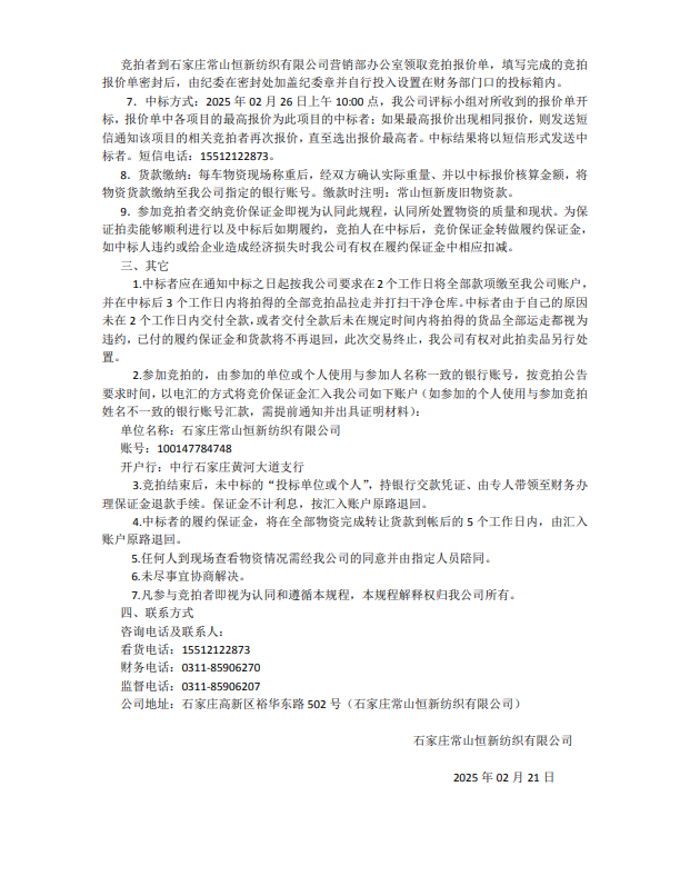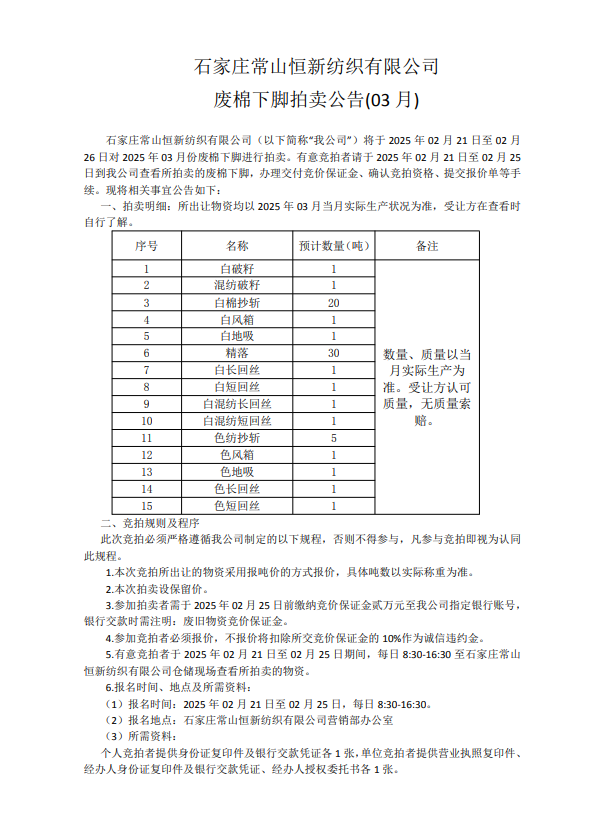 石家莊常山恒新紡織有限公司 廢棉下腳拍賣公告(03月)